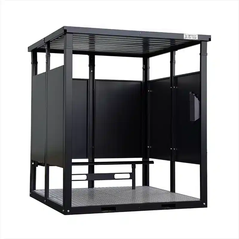 Dette demonterbare røgerum er fuldt sammenklappeligt og kan nemt monteres eller demonteres efter behov. Det kan også flyttes uden problemer, da det er udstyret med både løfteøjer og gafler til brug med kran eller gaffeltruck. Denne fleksibilitet gør det til en økonomisk og praktisk løsning for mange typer virksomheder.